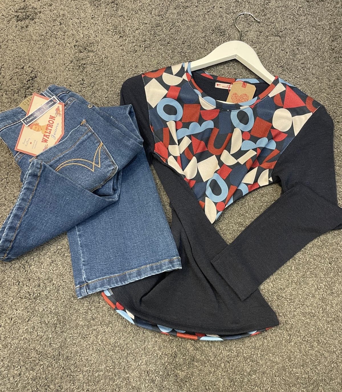 Explosión de color y diseño en la parte frontal: estampado geométrico súper atrevido. Punto cálido y cómodo. ¡Es esa prenda que te pone de buen humor nada más ponértela! 97% algodón 3%estano ¡NO es una camiseta cualquiera, es LA camiseta que va a definir tu otoño!