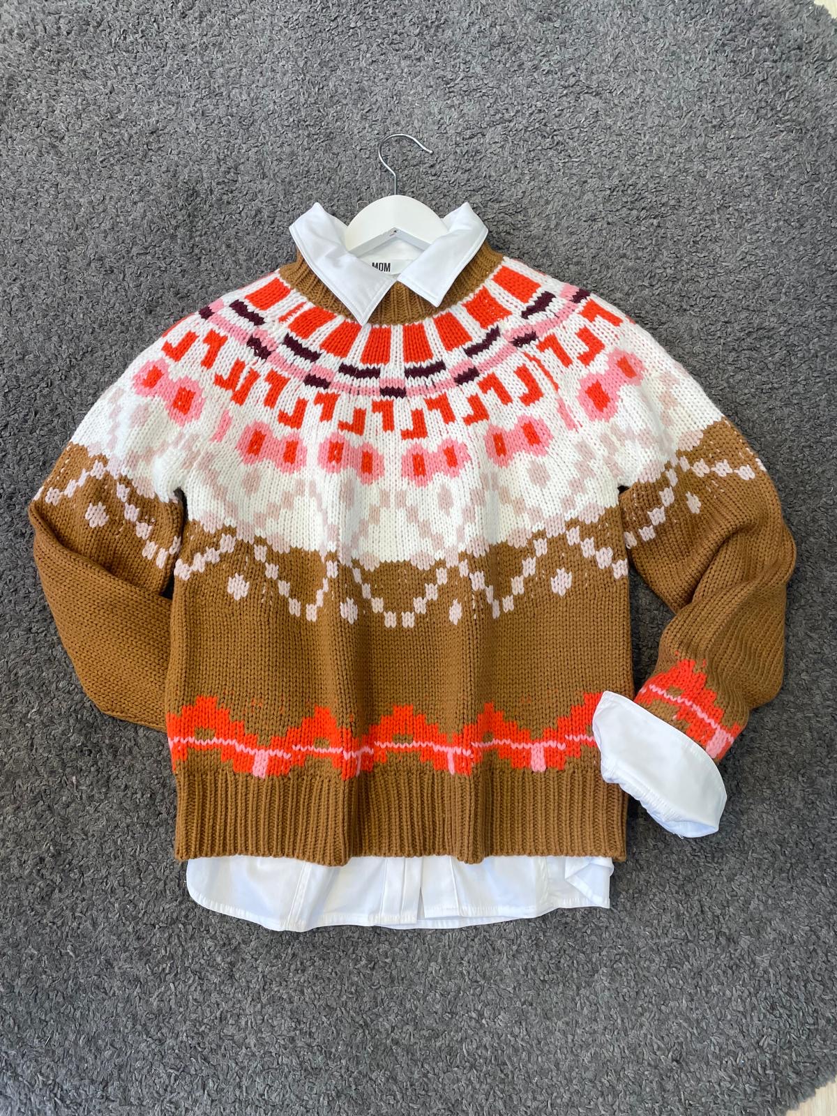 Jersey en tono camel tostado con una combinación de colores que le da un aire nórdico renovado y súper actual. Calentito pero ligero, elegante pero con carácter. El jersey que te pone de buen humor en los días más fríos. 100% acrílico